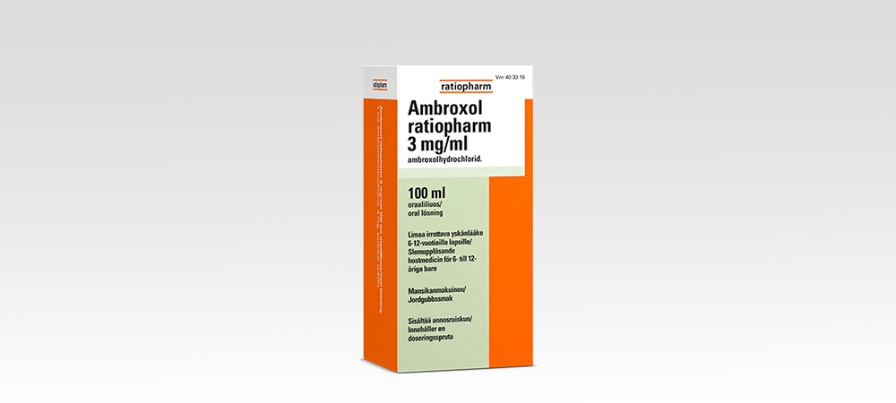 Ambroxol ratiopharm 3mg/ml yskänlääke ohentaa ja irrottaa limaa, jolloin lima on helpompi yskiä pois. Se on tarkoitettu otettavaksi suun kautta aterioiden jälkeen. Ambroxol ratiopharm -oraaliliuosta ei saa käyttää pidempään kuin 4-5 vuorokauden ajan ilman lääkärin määräystä. Pakkaus sisältää mittaruiskun. Mansikanmakuinen.