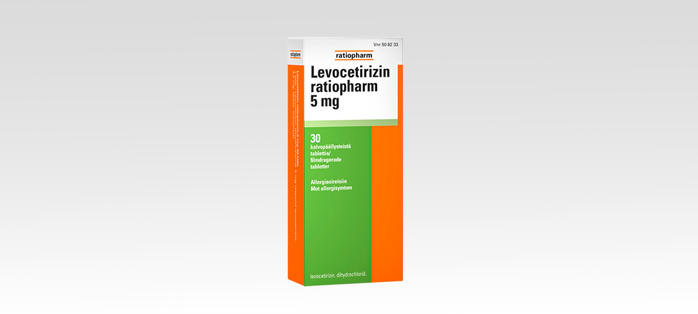 Levocetirizin ratiopharm 5 mg on allergialääke, joka on tarkoitettu siitepölyallergiaan liittyvien nenä- ja silmäoireiden hoitoon (nenän ja silmien limakalvojen allerginen tulehdus) sekä nokkosihottumaan (urtikaria). Vaikuttava aine levosetiritsiini on antihistamiini.