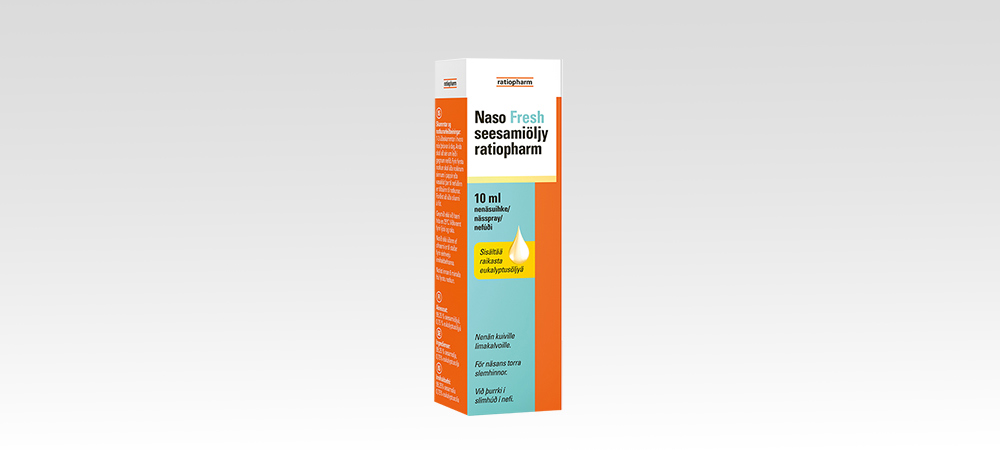 Naso Fresh seesamiöljy ratiopharm pehmentää ja voitelee nenän kuivia limakalvoja. Valmistetta voidaan käyttää kuivan huoneilman tai kuivan ilmaston kuivattamien nenän limakalvojen kosteutukseen. Ei alle 2-vuotiaille lapsille.